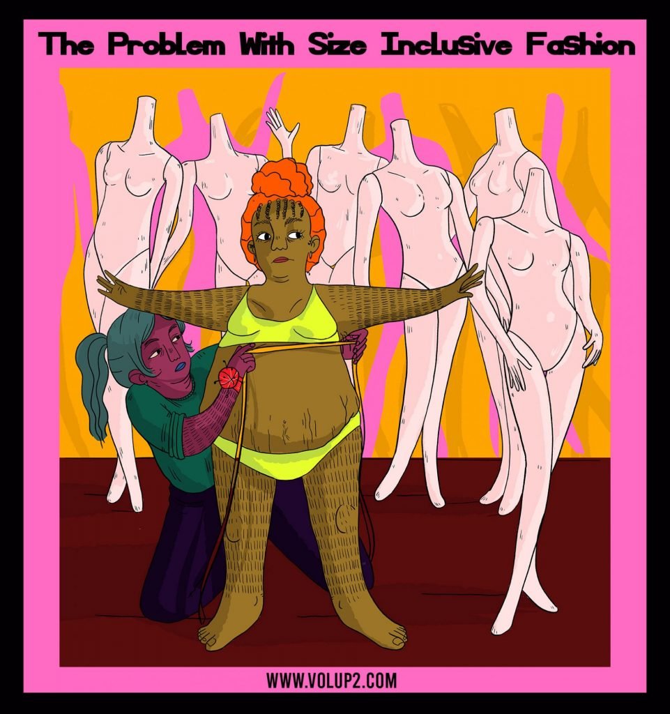 The Problem With Size Inclusive Fashion by Natalie Krauter Translated by Jordan Riviere, Illustration by Stephany Victorine, Graphics by VOLUP2